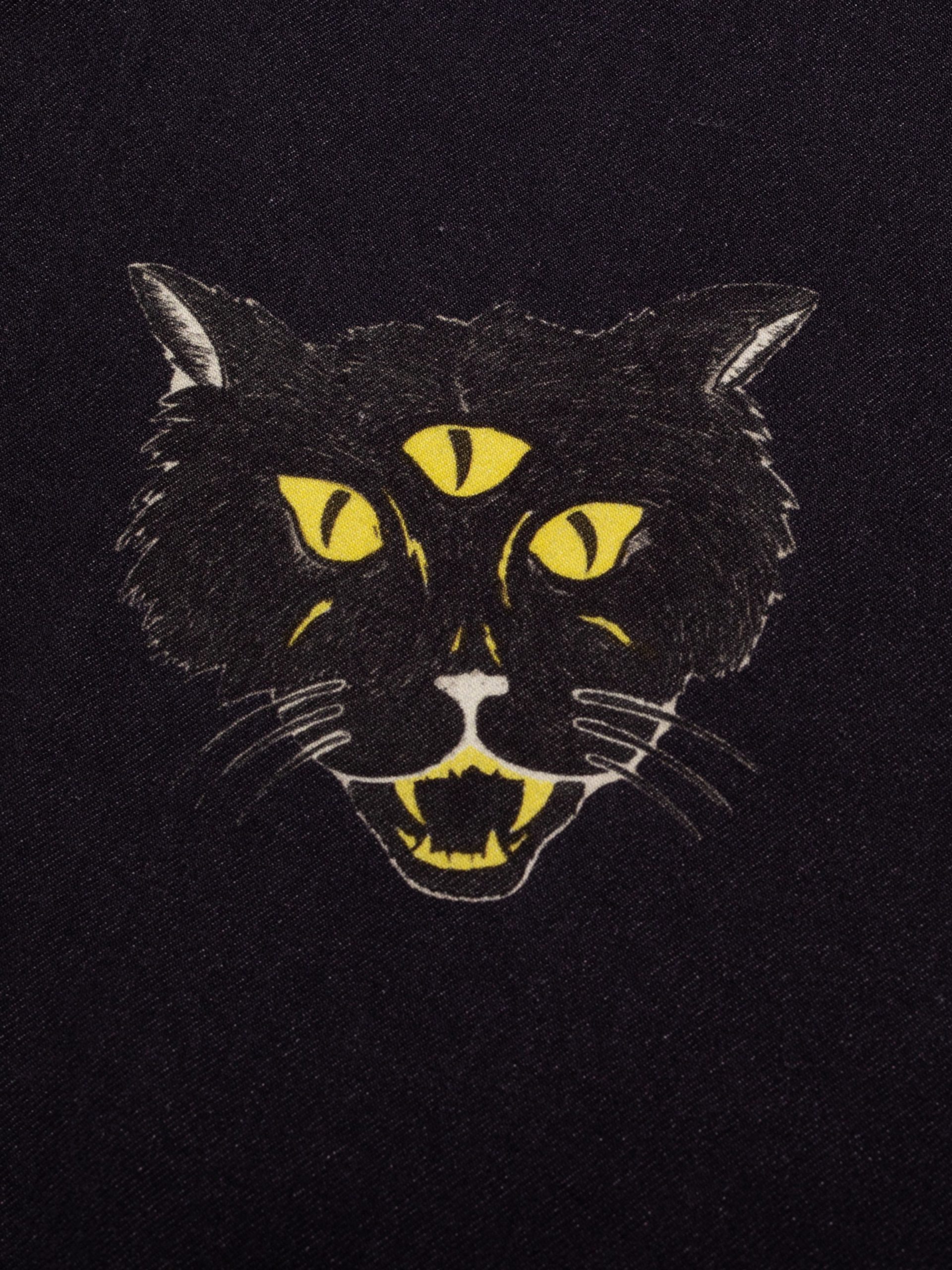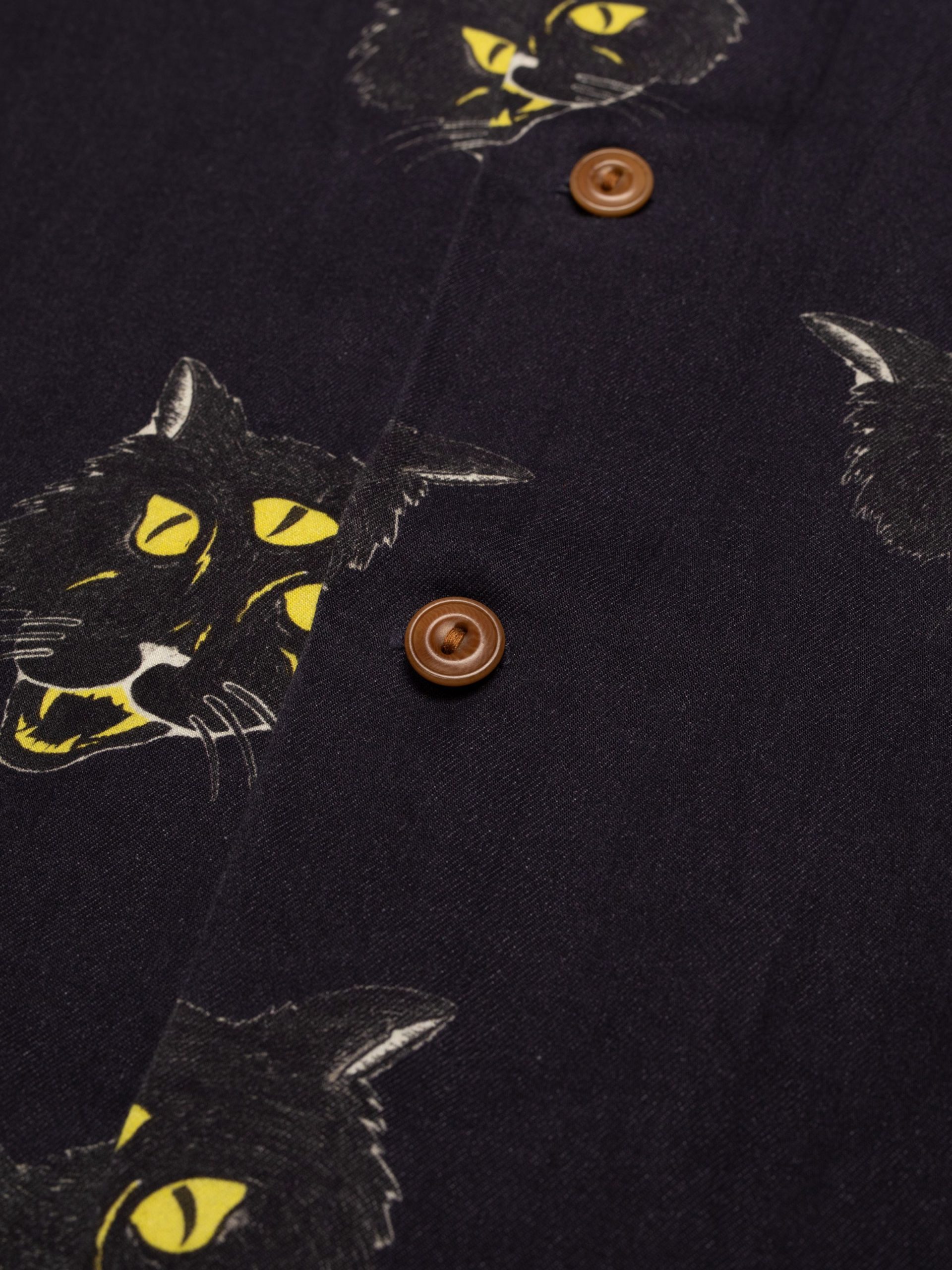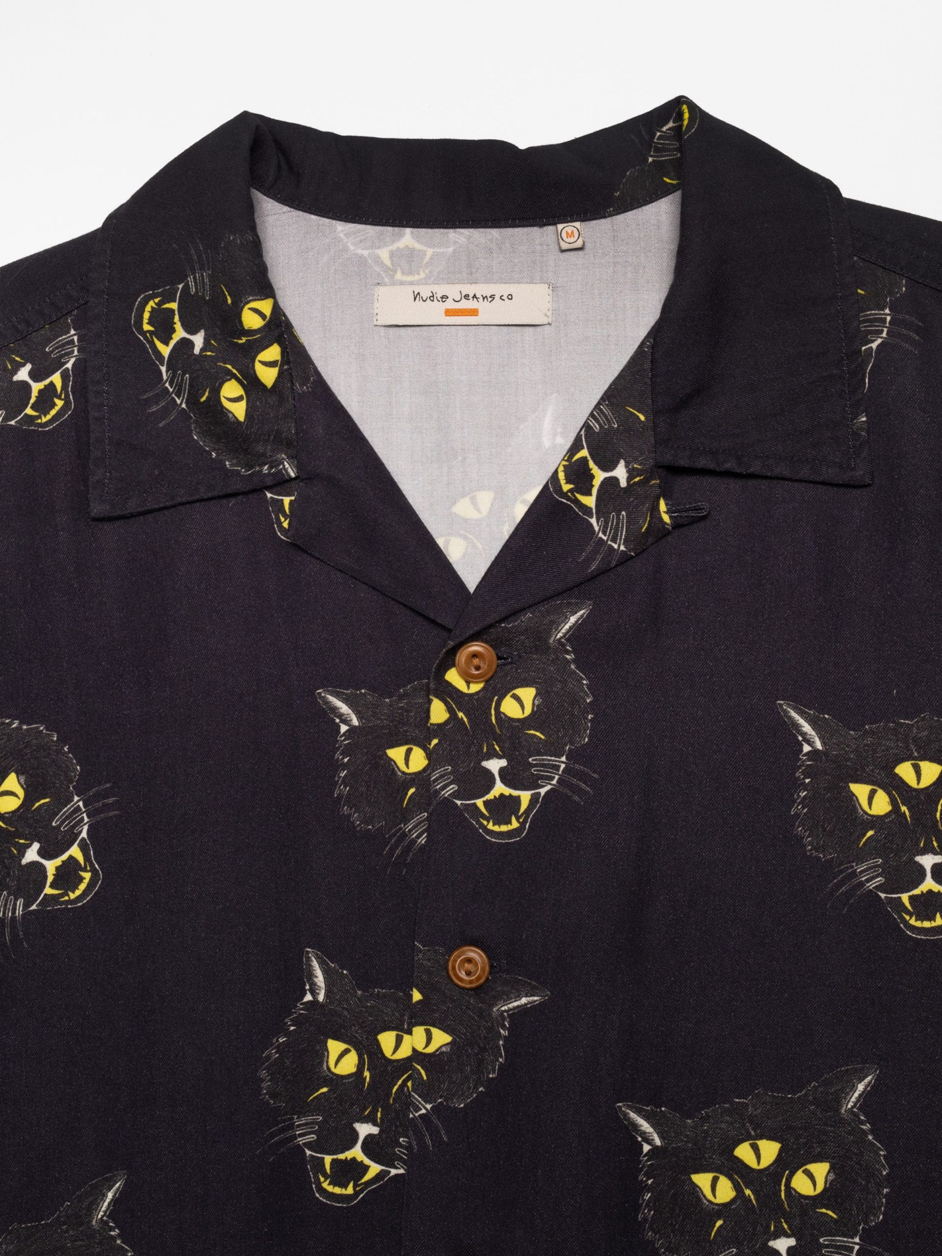 Short-sleeved shirt in soft TENCELâ„¢ Lyocell with three-eyed cat print. Features camp collar, side slits, and corozo buttons in a slim fit.
