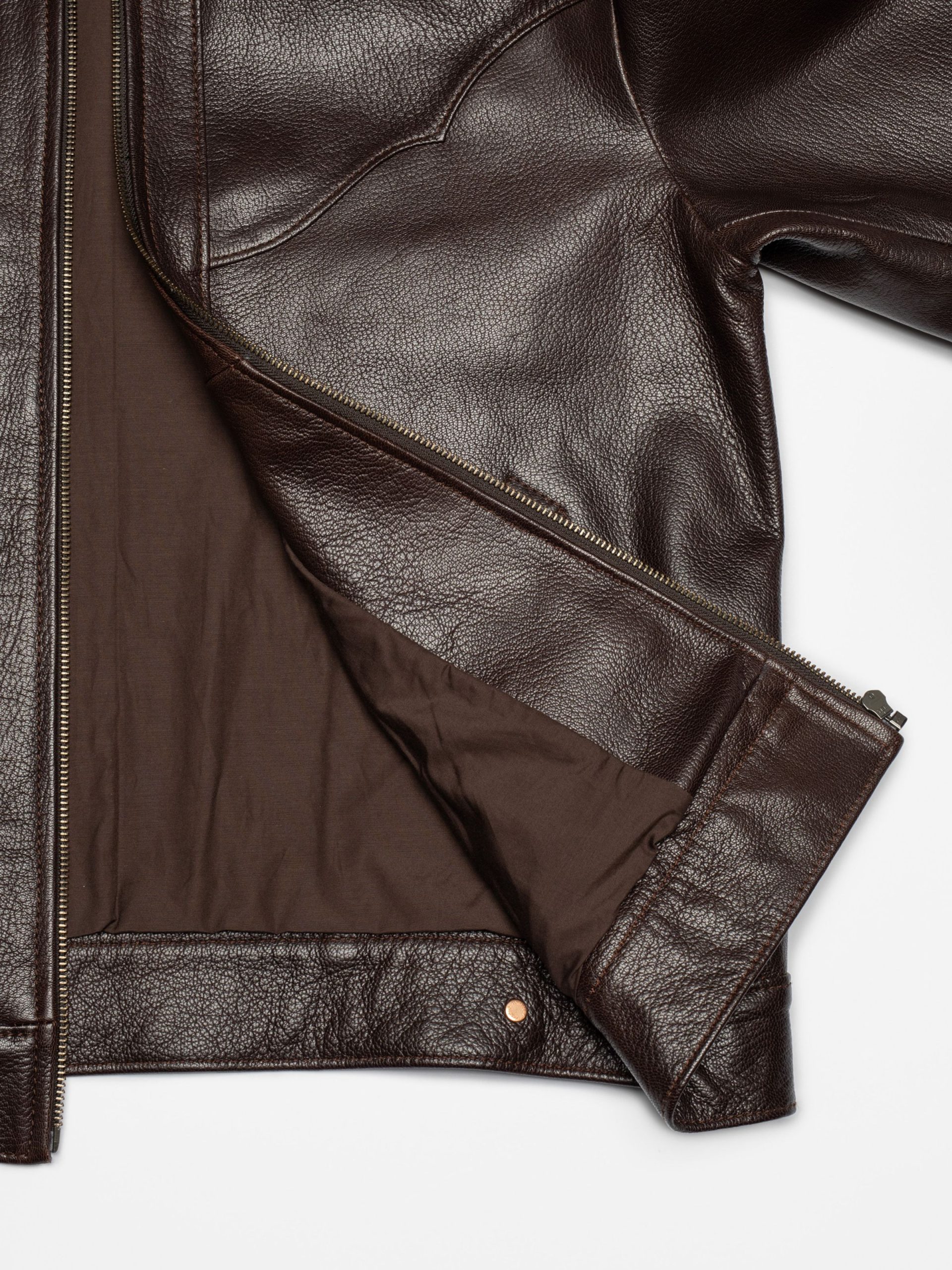 Jacket rendered from an impeccably supple, butter-soft, semi-vegetable-tanned goat skin leather. It has a deep, chocolate-brown shade and fine luster. The cut is clean with a straight, regular fit. It features jetted side pockets and buttoned tabs at the cuffs and waistband for a custom fit. Joppe is fully lined with black twill, mixing recycled polyamide and organic cotton. Inside, you also find two jetted pockets to store small personal belongings. When you buy this jacket, you can be sure we have paid our share of living wages.