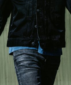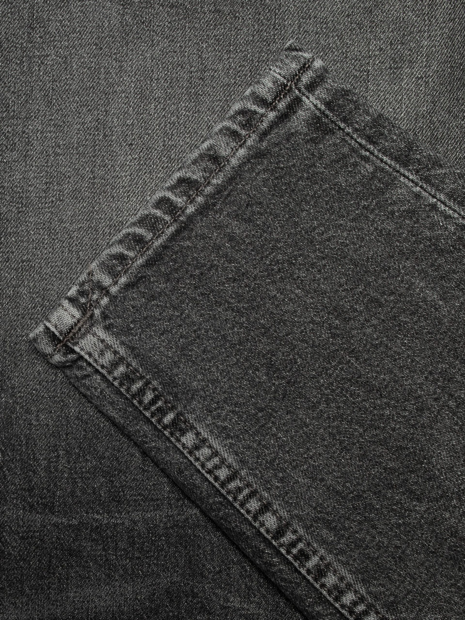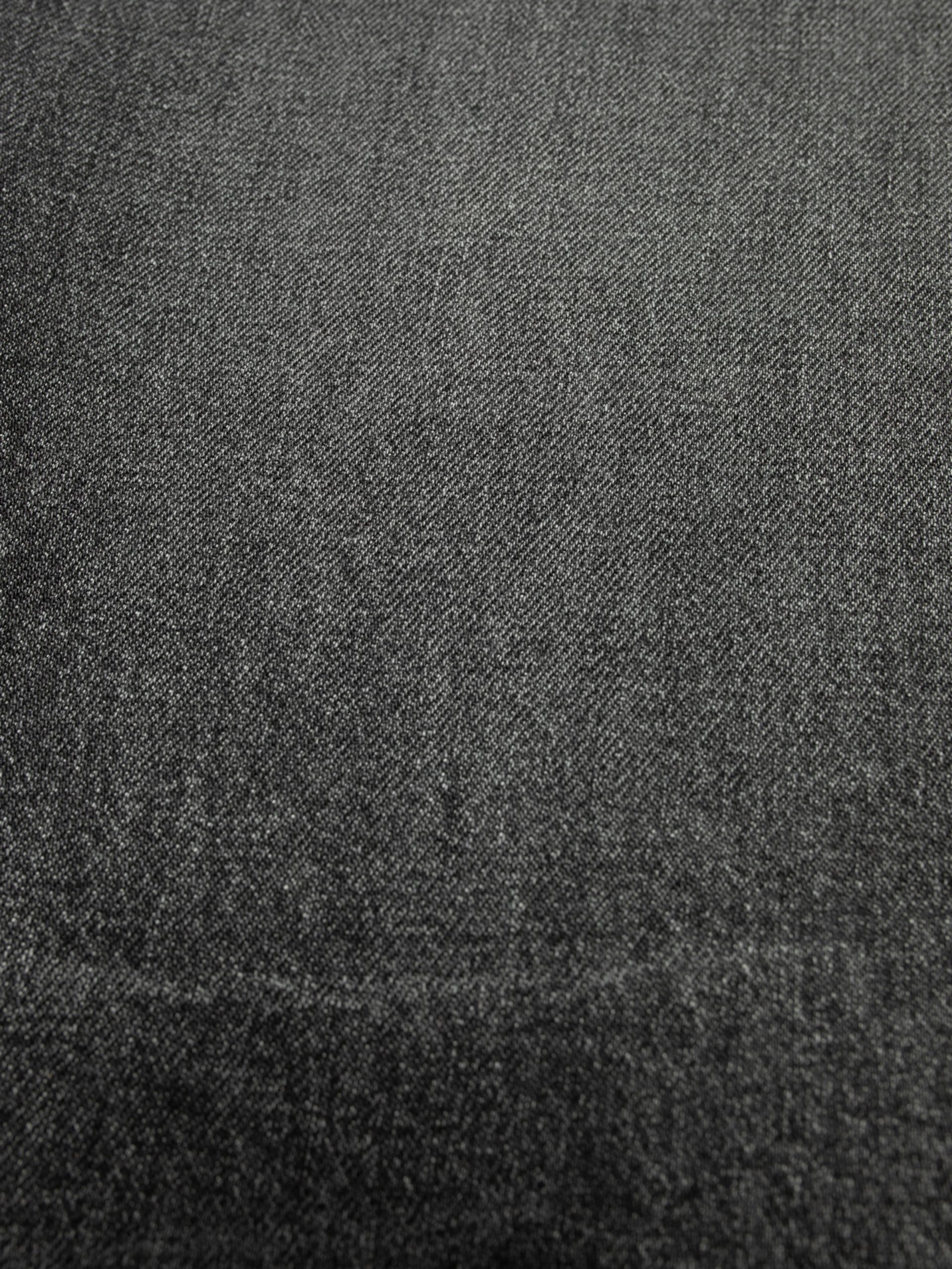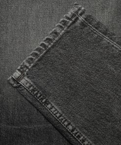 Slim-fit jeans with a tapered leg, featuring a striking gray wash. Crafted from black denim with a rustic texture, these jeans display an intricate interplay of highs and lows. Highlighting abrasions and sharp wear marks further enhance their depth, giving them a bold and distinctive monochromatic look.
