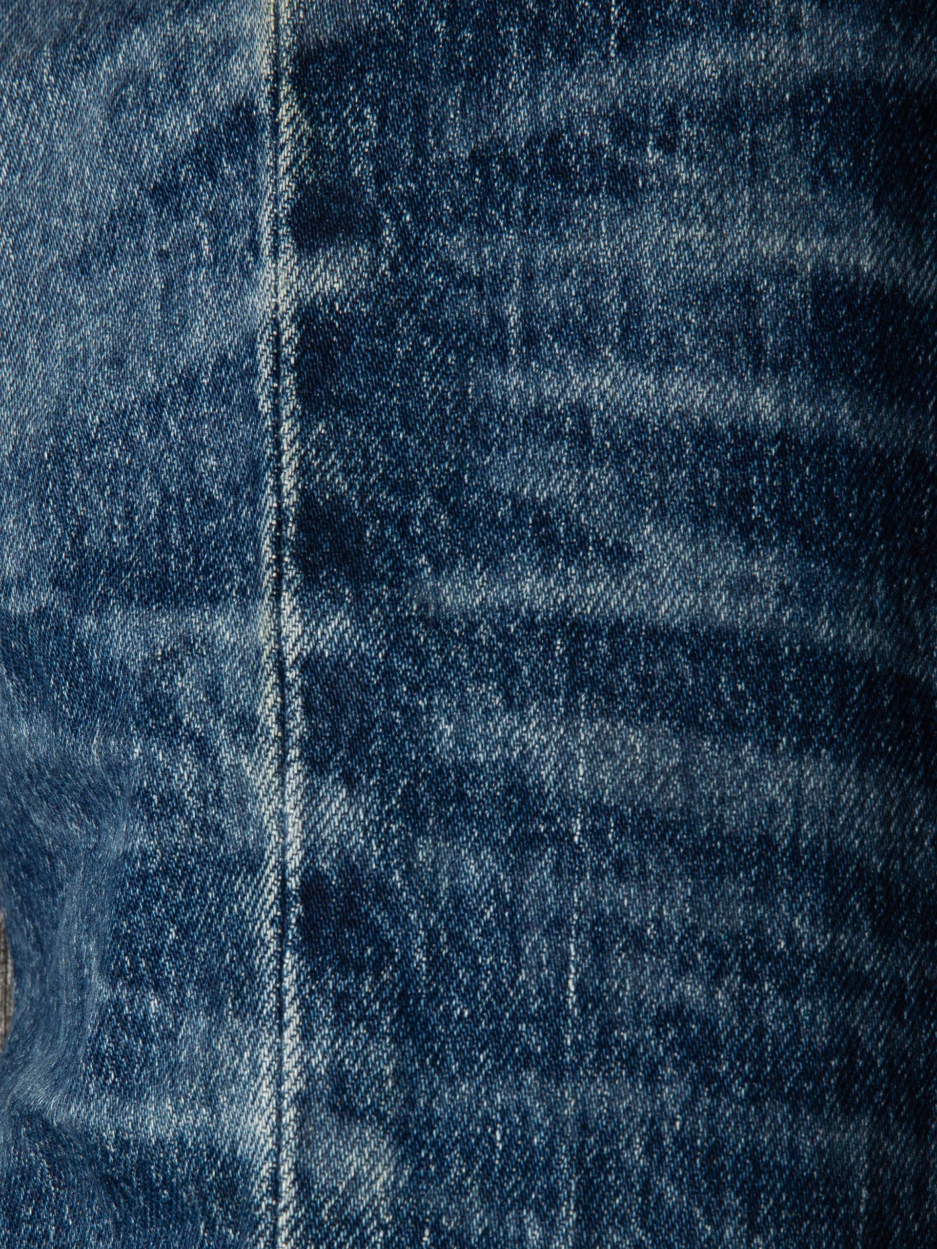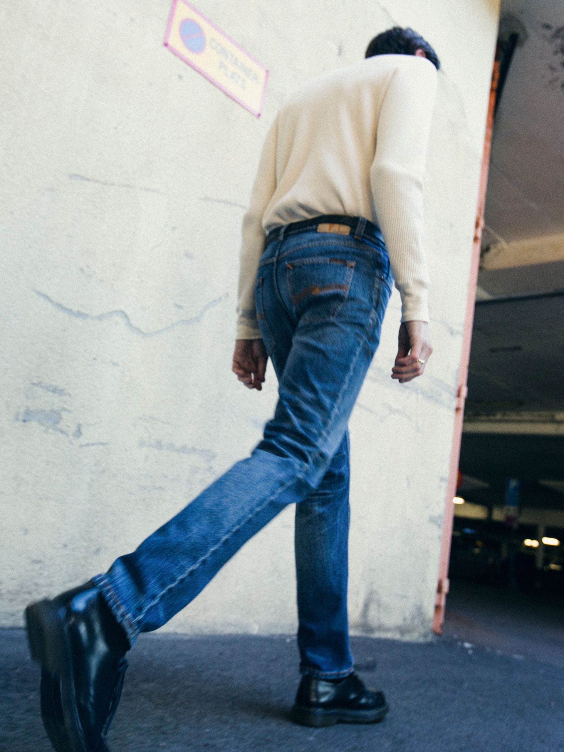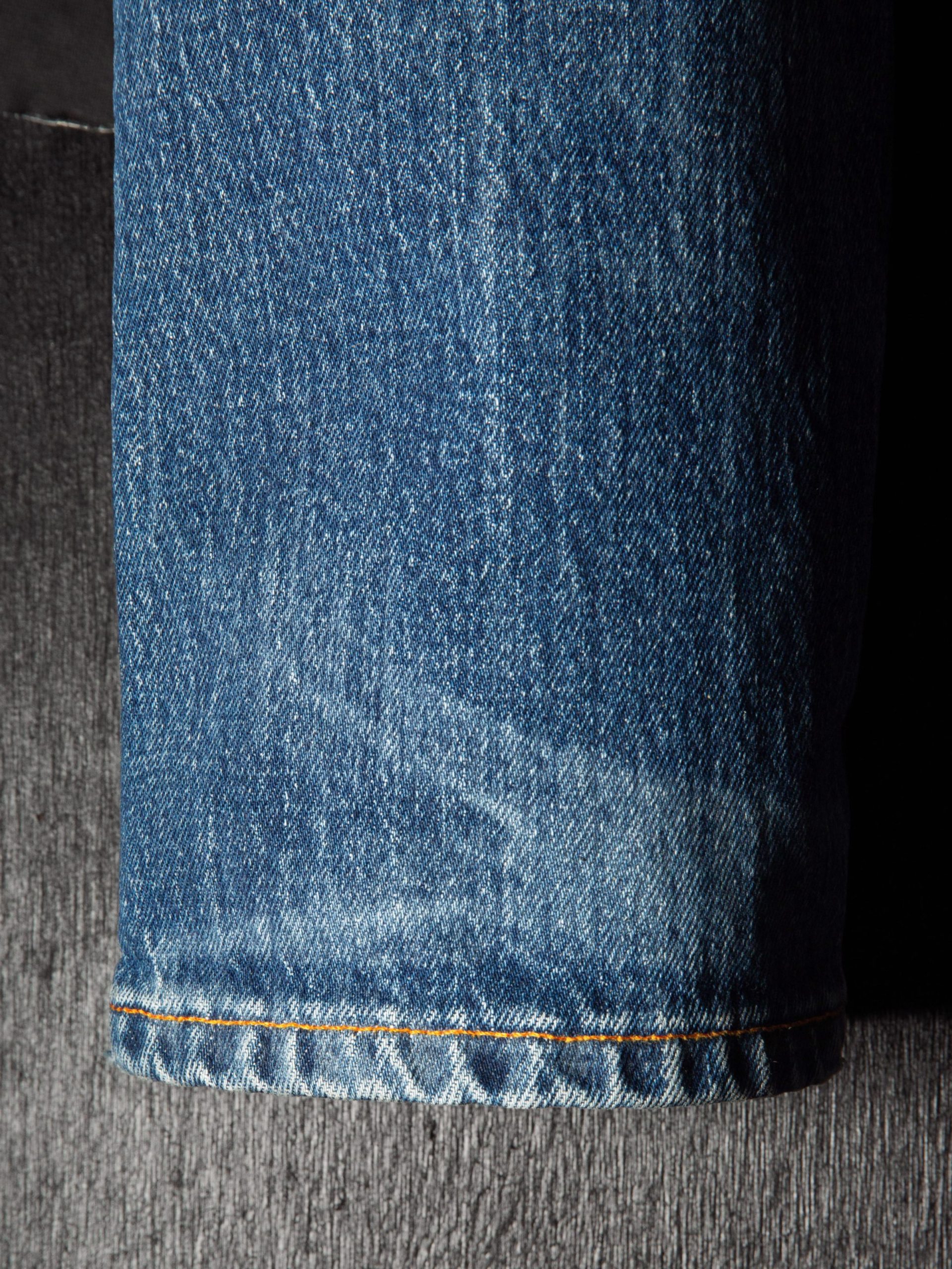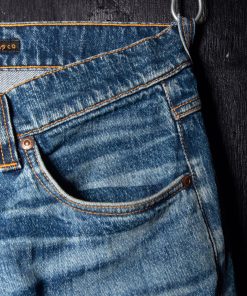 Slim-fit stretch jeans with a dark blue indigo wash and authentic wear patterns. Crafted from 13 oz. organic cotton denim with contrasting highlights.