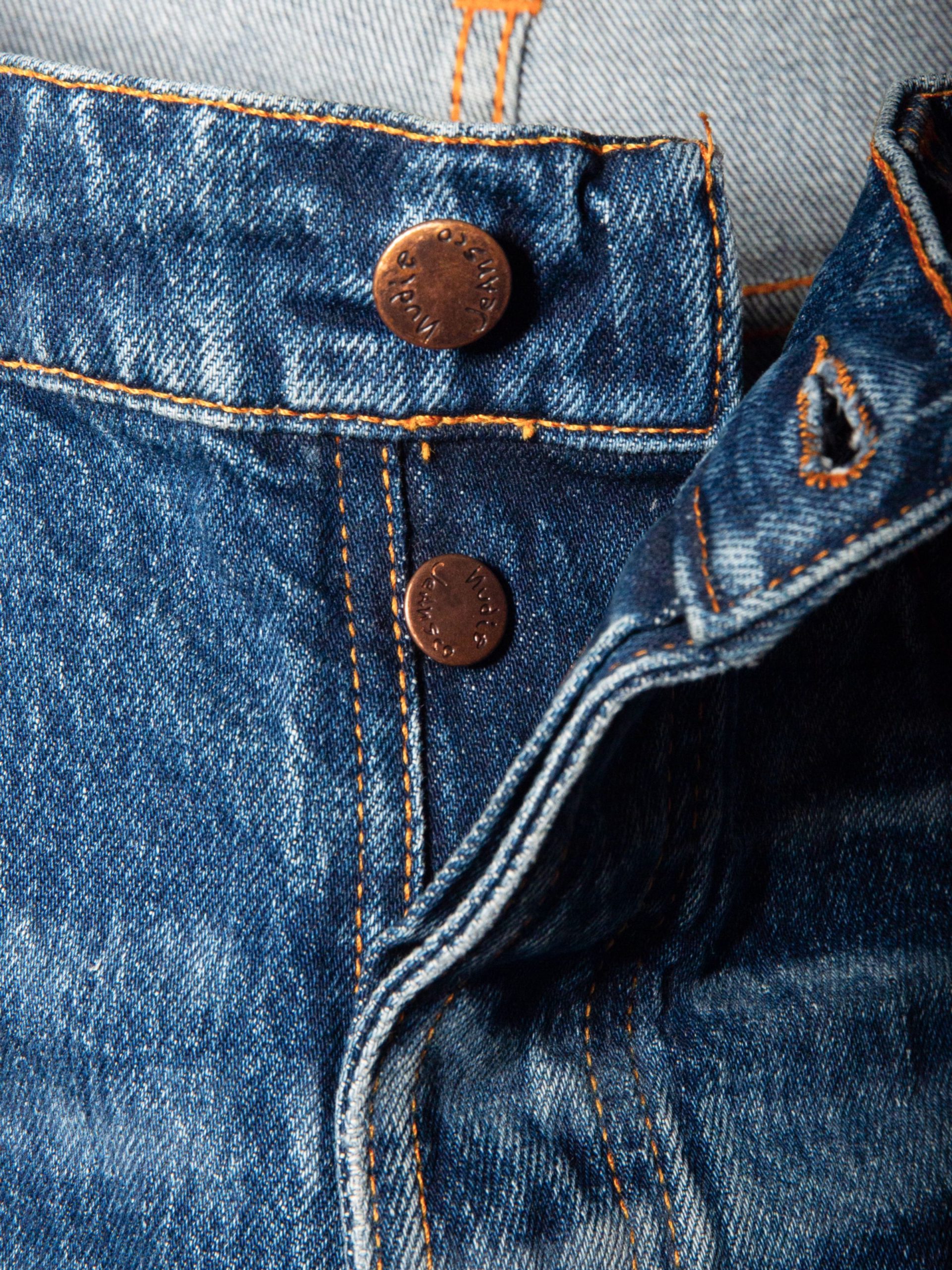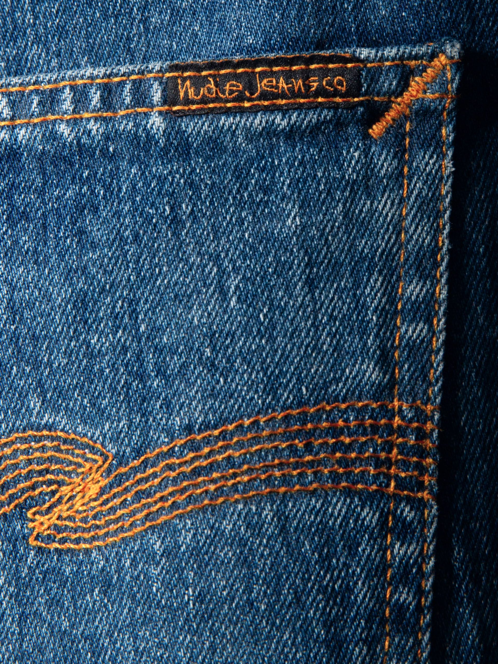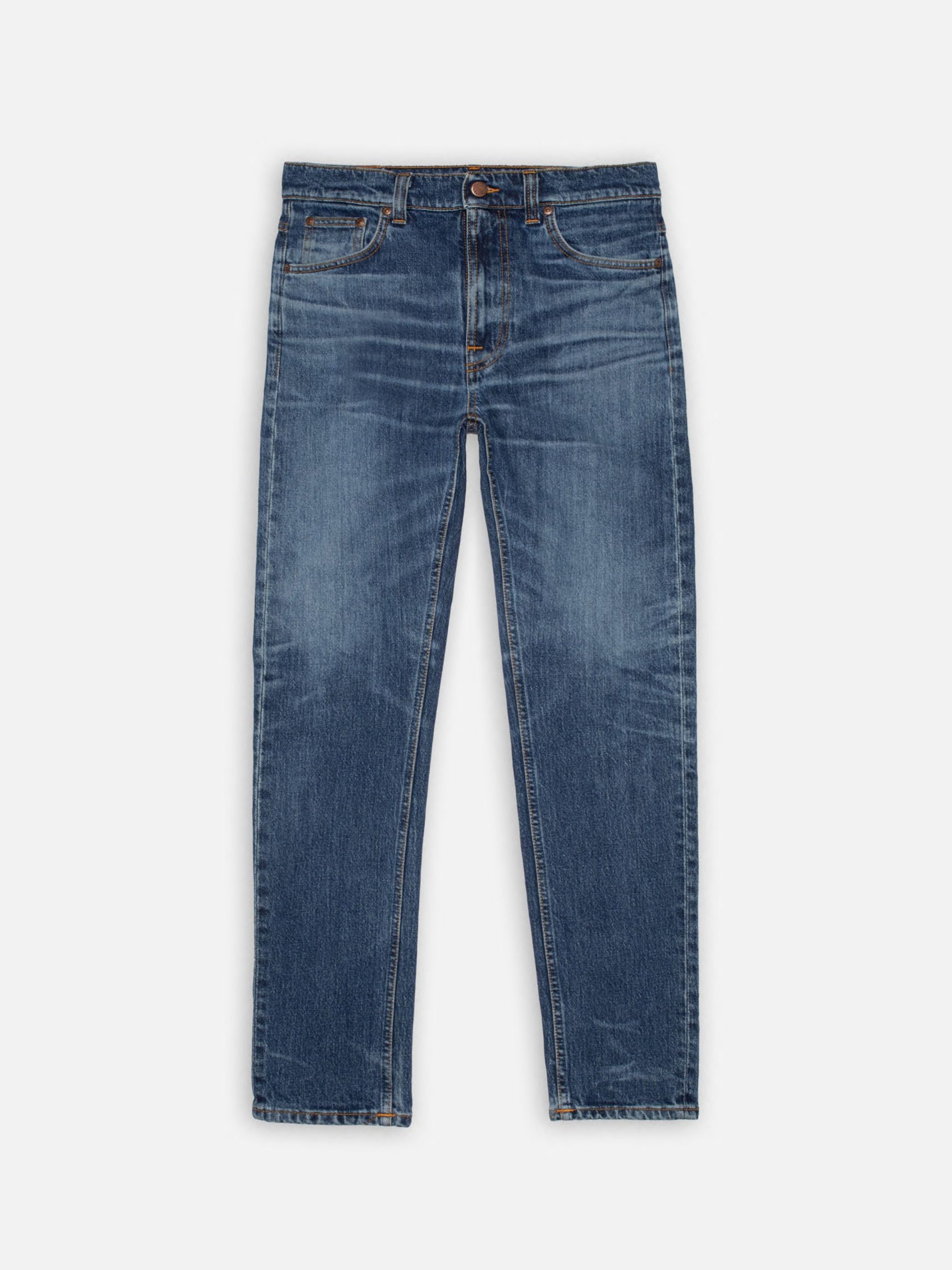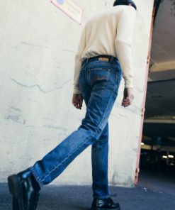 Slim-fit stretch jeans with a dark blue indigo wash and authentic wear patterns. Crafted from 13 oz. organic cotton denim with contrasting highlights.