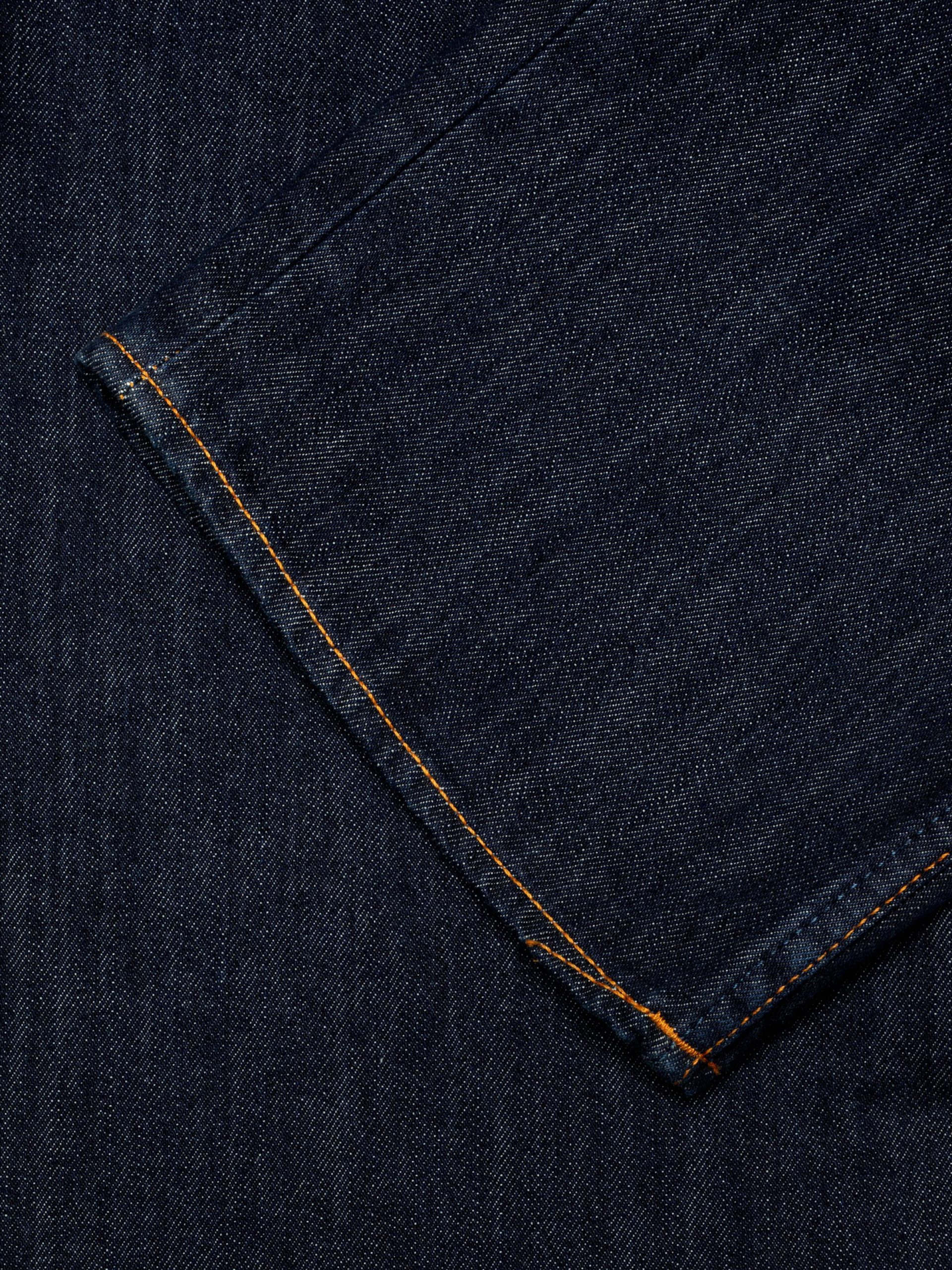 Wide-legged, loose-fit jeans, crafted from regenerative organic cotton in a beautifully simple deep blue wash. The inspiration behind this wash is refreshingly straightforward: a single home wash of dry denim. Crafted from vintage-style deep indigo denim with a medium slub character, the treatment shifts the hue from a dark blue to a rich, redcast blue, while transforming the denim’s texture from flat to beautifully irregular and textured.rn