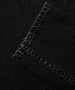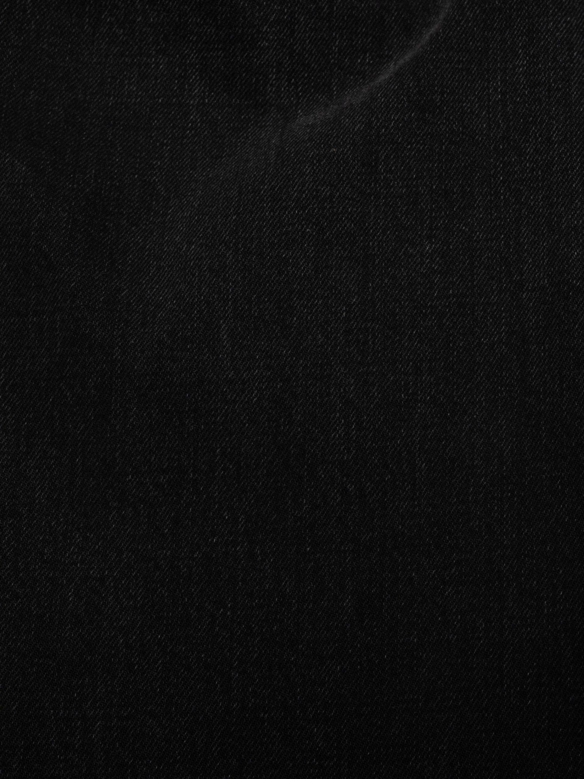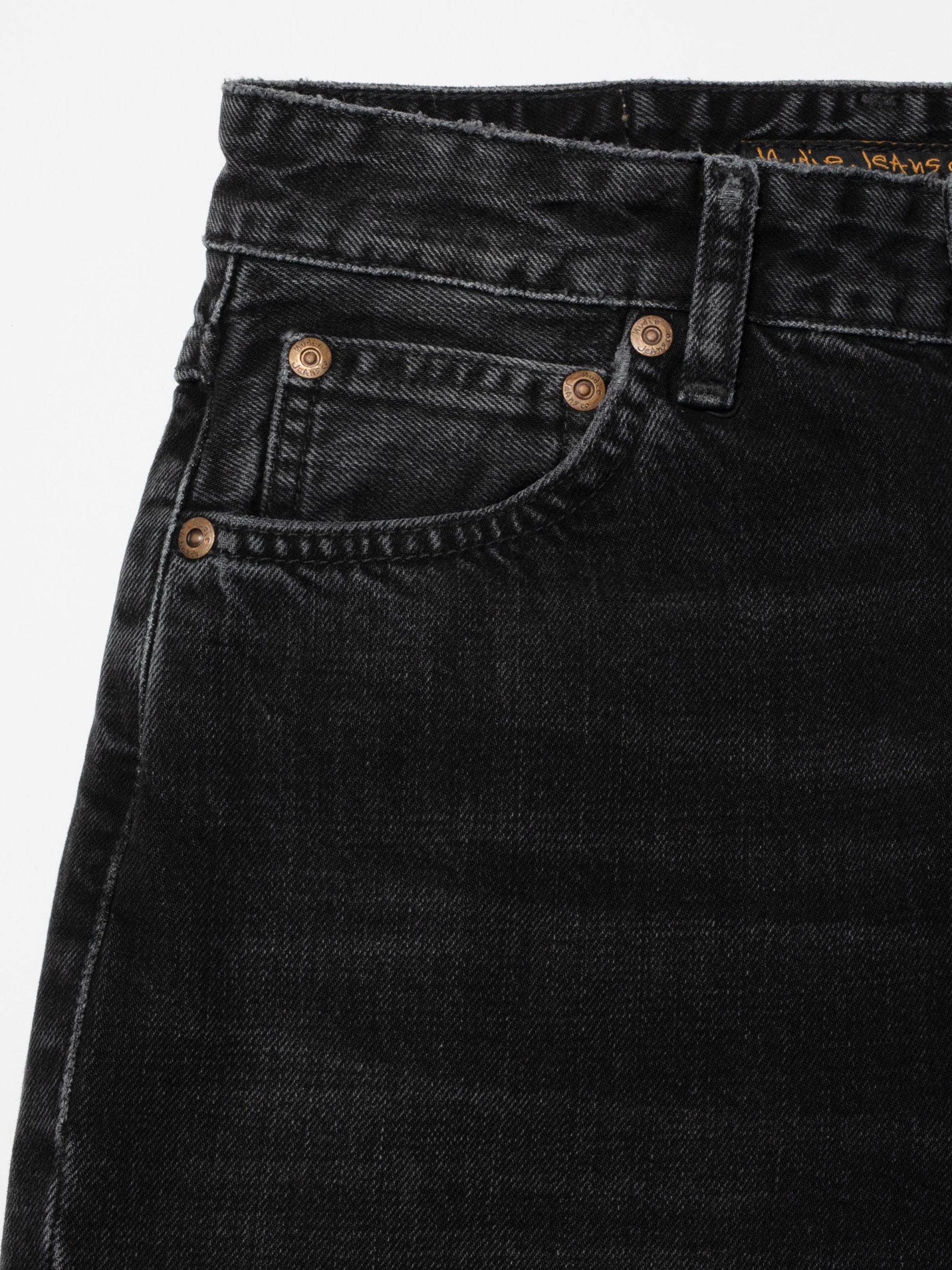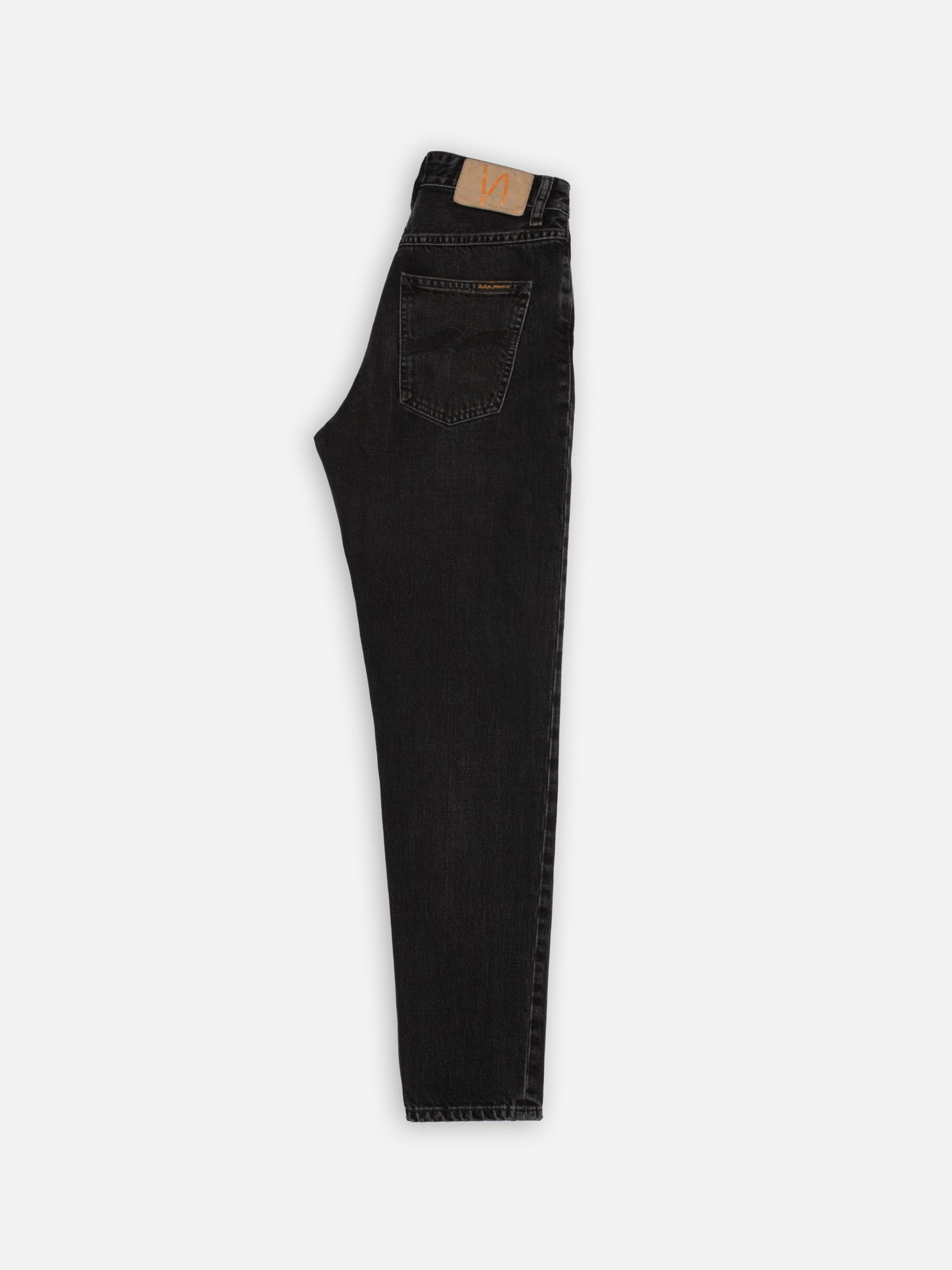 High-waist, regular-fit jeans with a tapered leg, featuring a saturated and beautifully textured black wash. Crafted from exceptional black-overdyed-black denim with pronounced slubbiness, the wash reveals a striking salt-and-pepper grain and a subtle crosshatch texture. While showcasing contrasts, the wash retains deep pitch-black tones, resulting in a wonderfully rich and dynamic black finish.rn