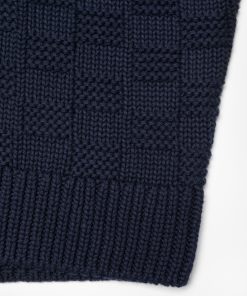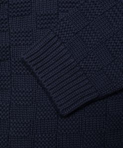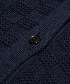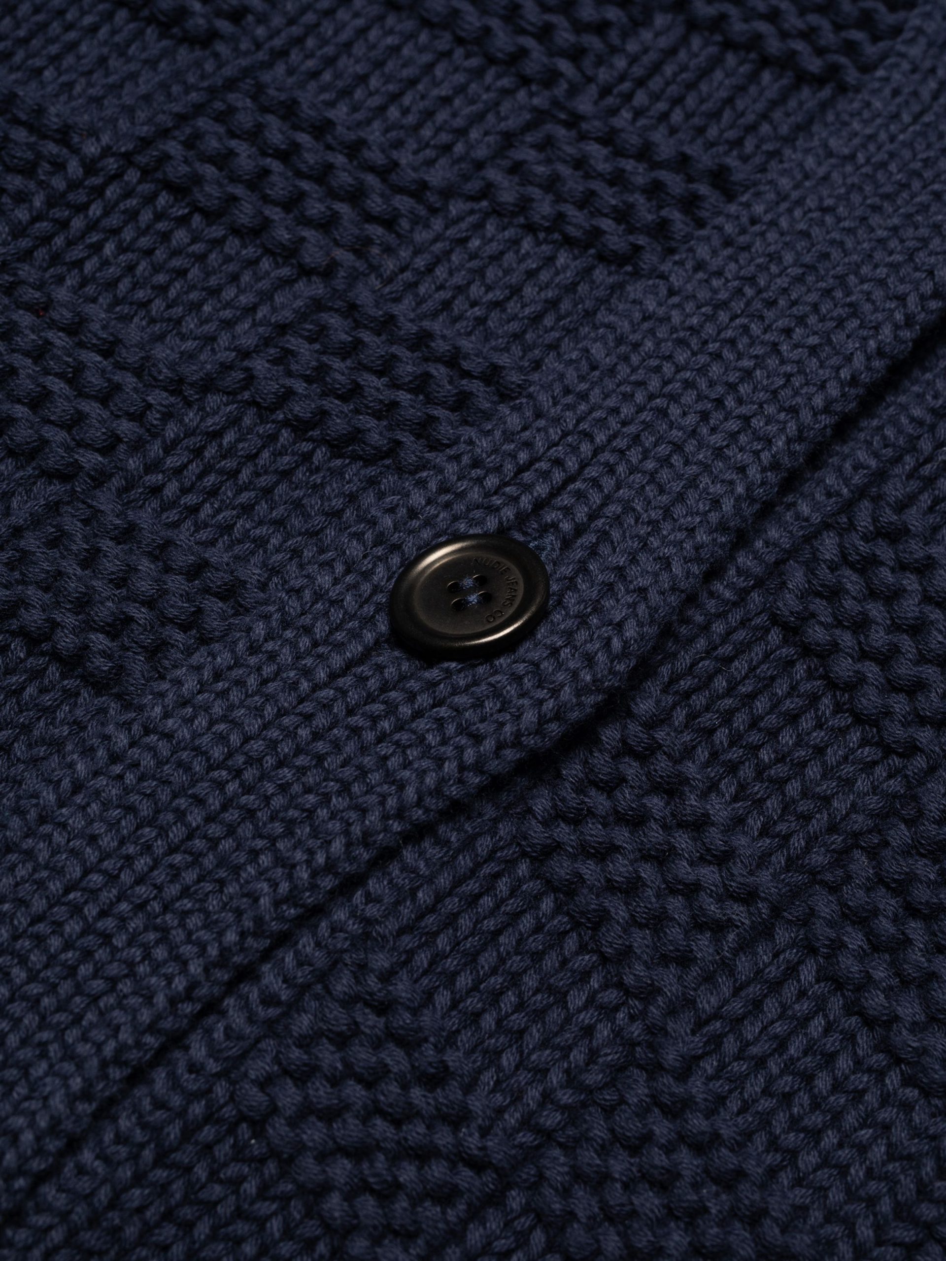 V-neck cardigan made with soft organic cotton yarn in a deep dark blue shade. The technique used for this knit is the so-called checkerboard stitch knitting. The hems, neck, and buttoned front are finished with a 1×1 rib.
