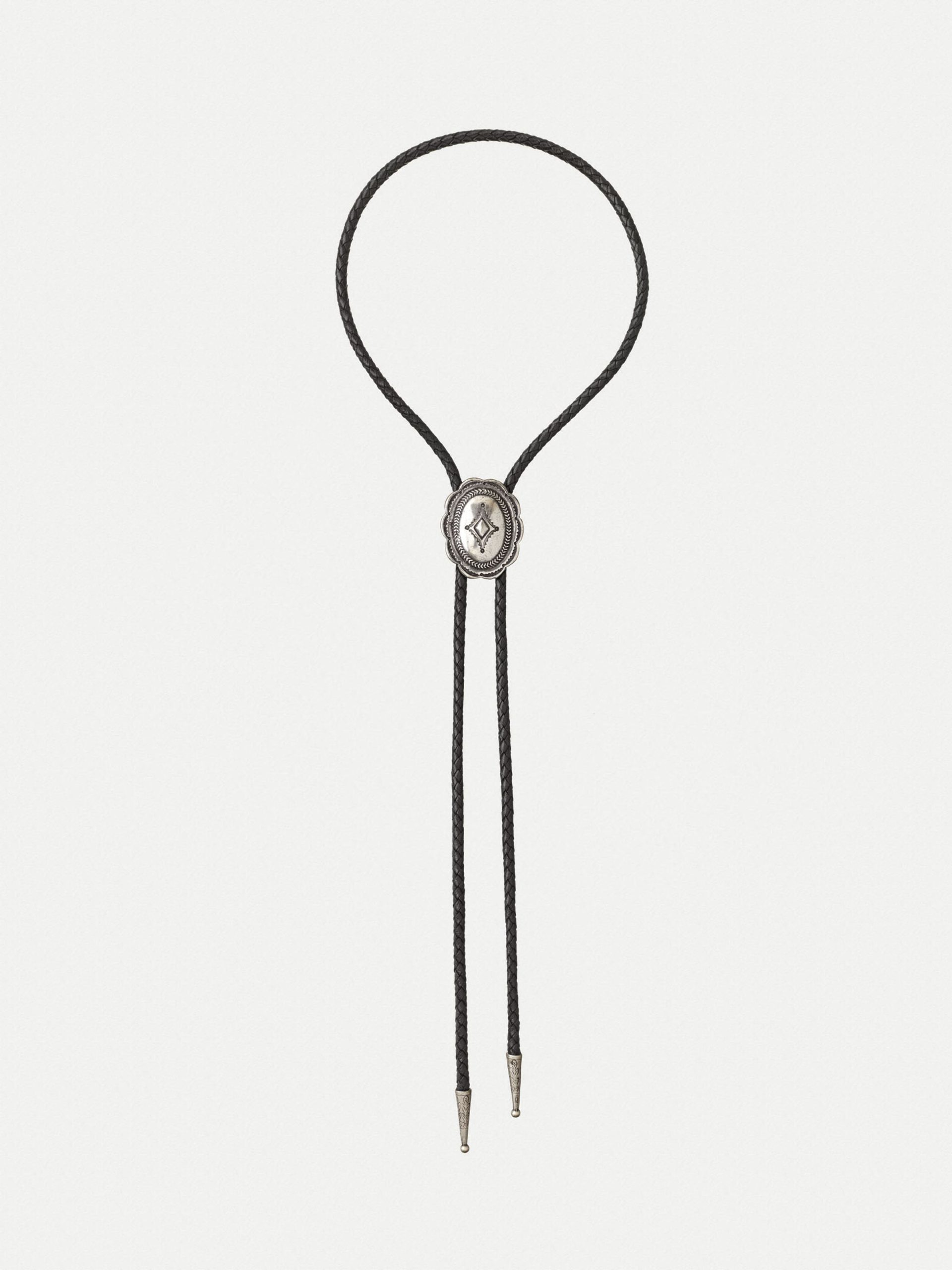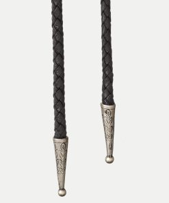 Bolo tie made from vegetable-tanned leather strips that have been braided to a cord.