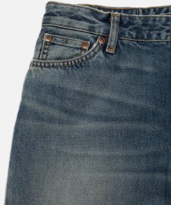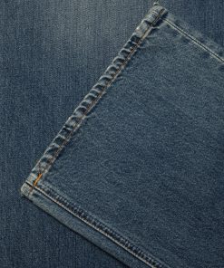 A loose, low-waist fit with a wide leg, expertly washed for a vintage-inspired aesthetic with sharp wear marks. The rich dark blue hues are enhanced by warm highlights, while the wash beautifully reveals the denim’s texture. Flat-abrasion areas emphasize the yarn slubs, and the darker, unabraded sections showcase subtle marble patterns, adding depth and character to the fabric.